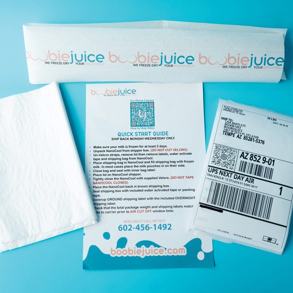 • A complete breast milk shipping kit and everything needed to ship your milk to BoobieJuice.